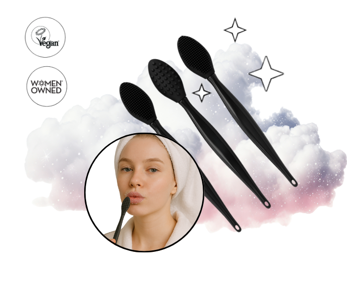 A 3-pack of Premium Lip Exfoliators featuring 100% BPA-free silicone tips and eco-friendly wheat straw handles, with one side to exfoliate dry skin and the other to stimulate circulation for smooth, renewed lips.